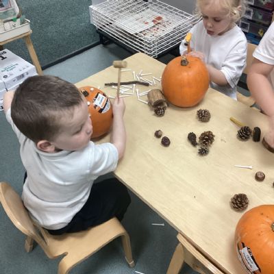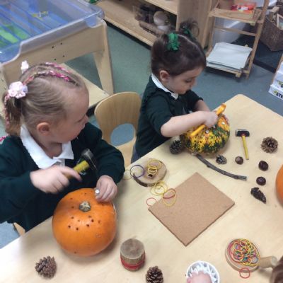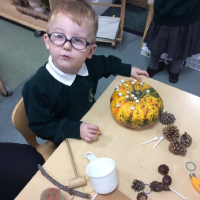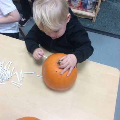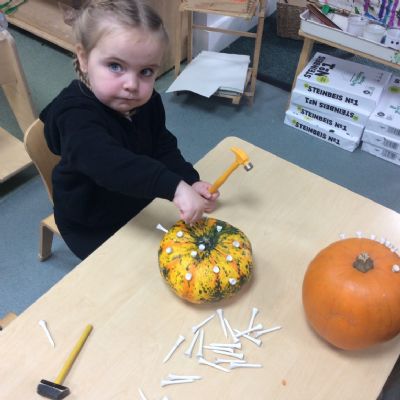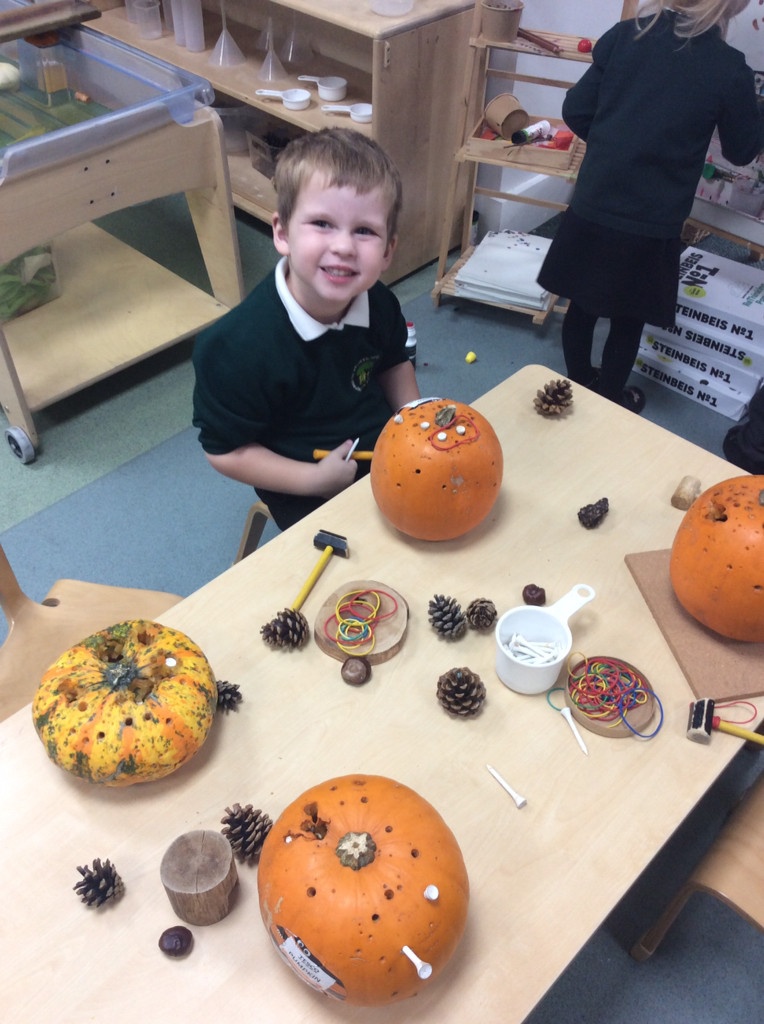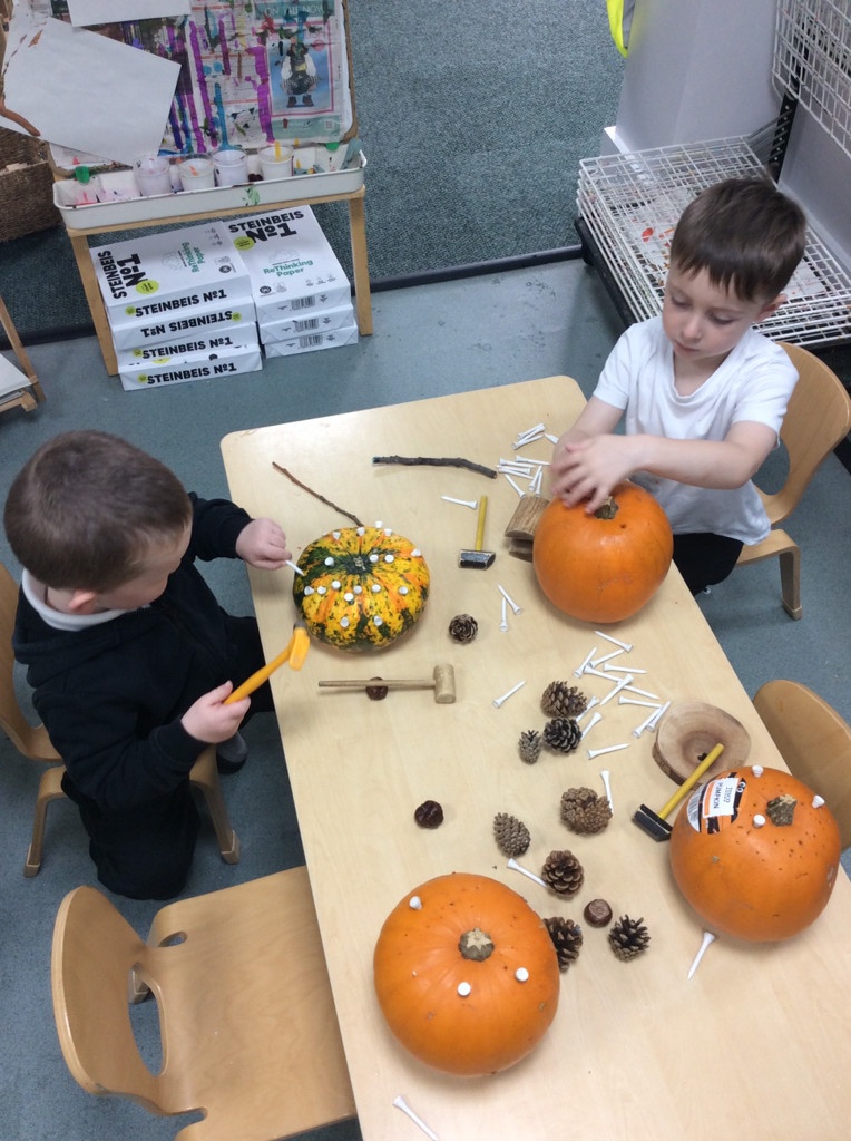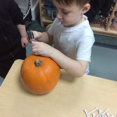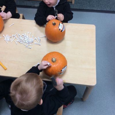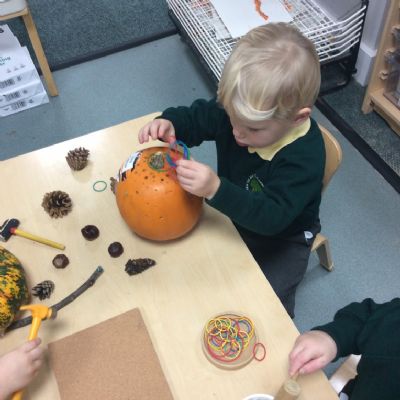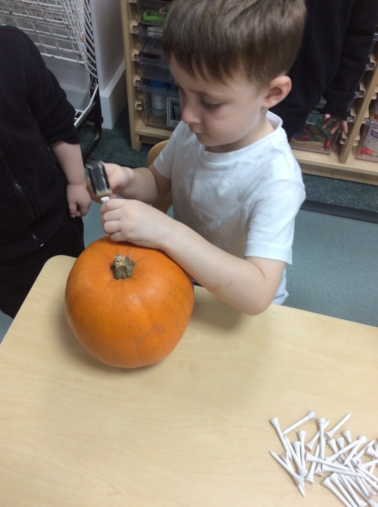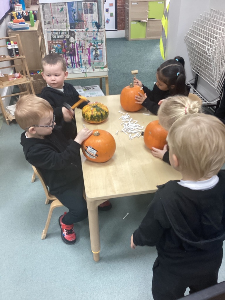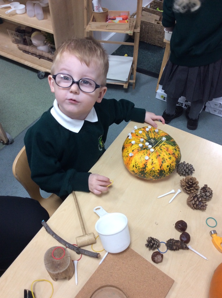 In nursery this week we have been exploring pumpkins! The children have enjoyed feeling the pumpkins, smelling them and helped scoop out the seeds to create boats for the water tray. We have also been practicing our fine motor skills and building up our muscles by hammering tees into the pumpkins, we even added elastic bands to strengthen our fingers.