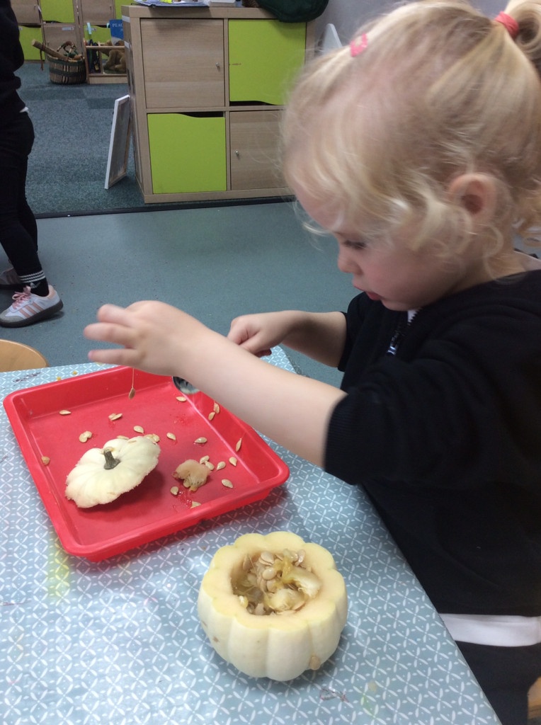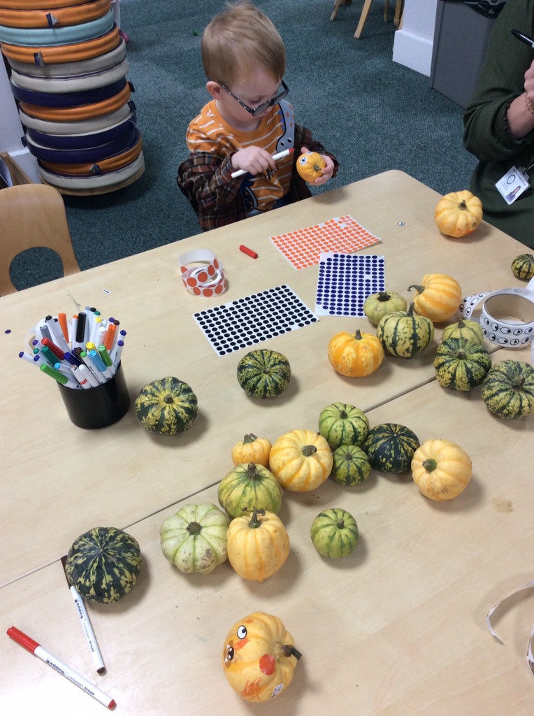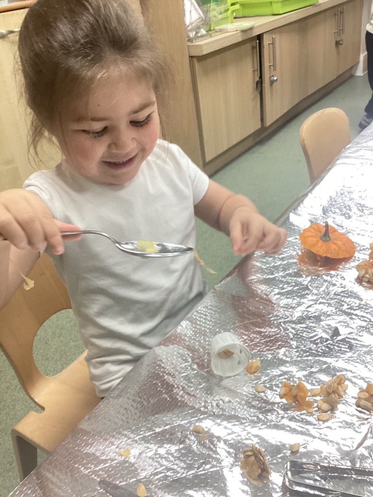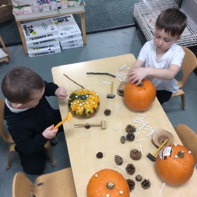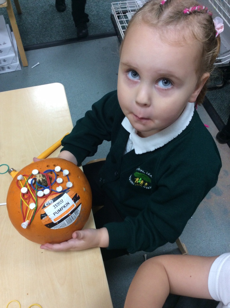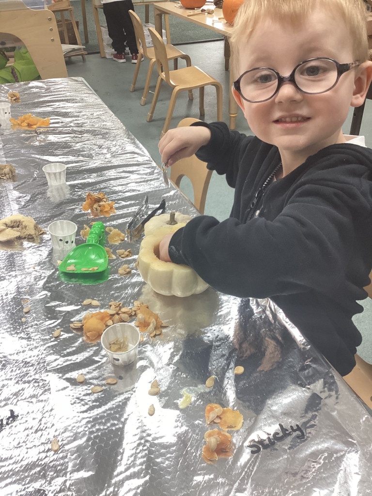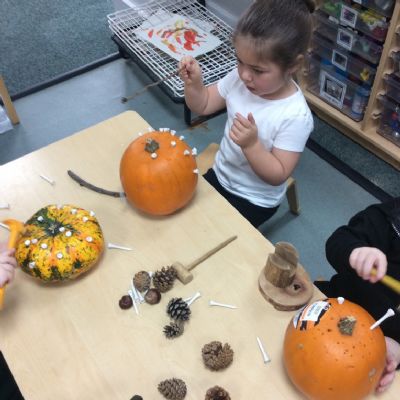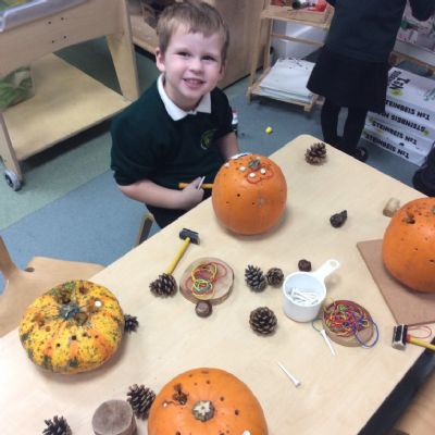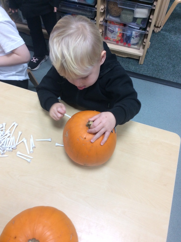 In nursery this week we have been exploring pumpkins! The children have enjoyed feeling the pumpkins, smelling them and helped scoop out the seeds to create boats for the water tray. We have also been practicing our fine motor skills and building up our muscles by hammering tees into the pumpkins, we even added elastic bands to strengthen our fingers.