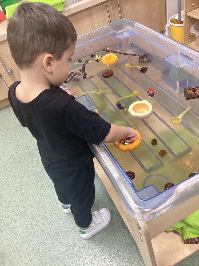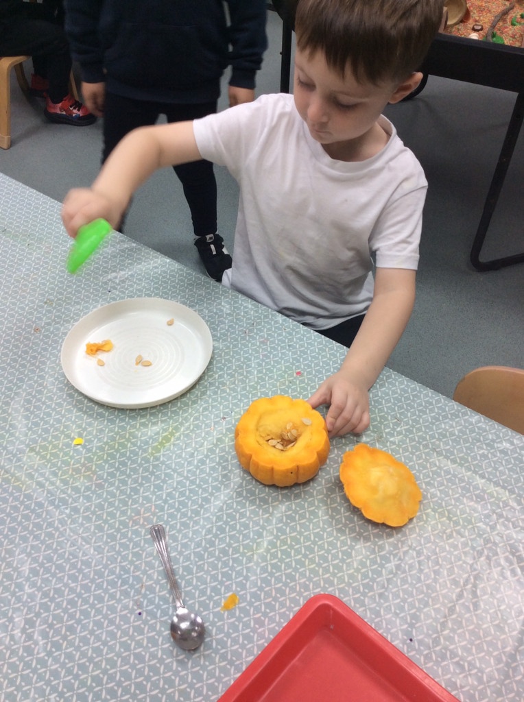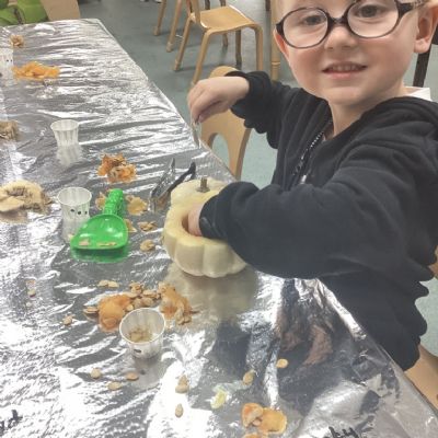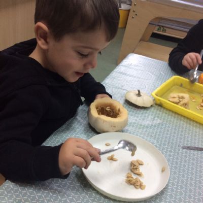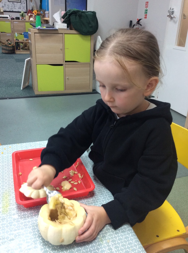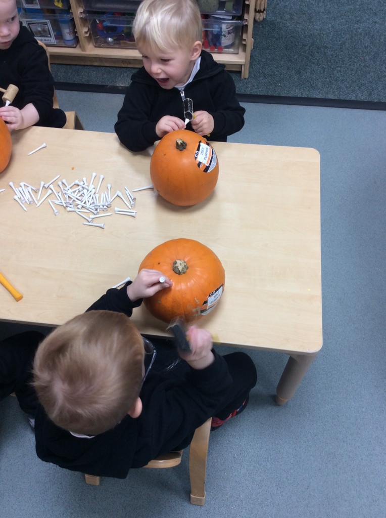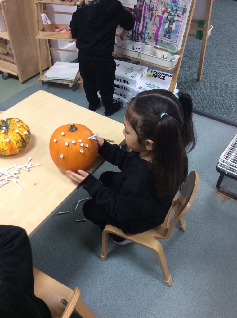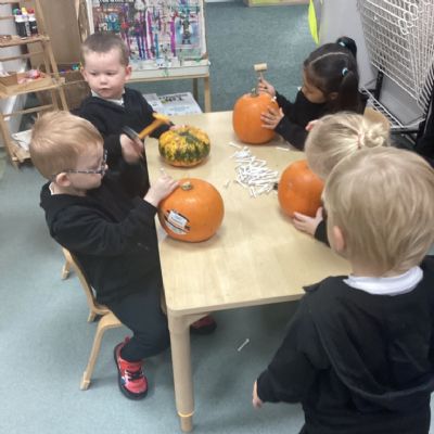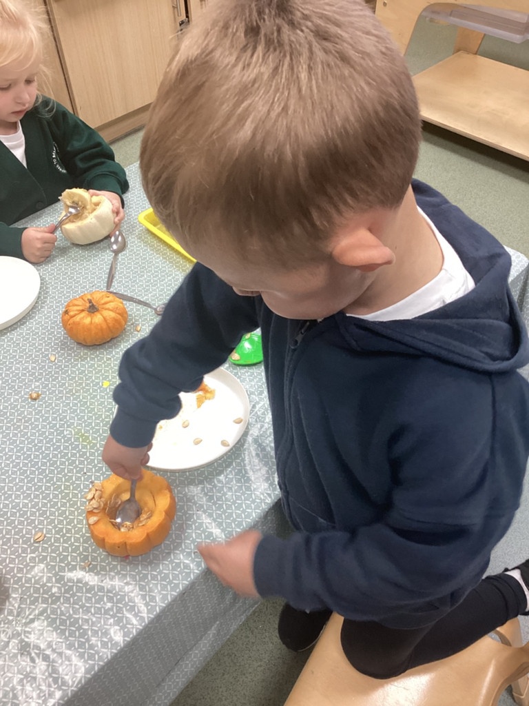In nursery this week we have been exploring pumpkins! The children have enjoyed feeling the pumpkins, smelling them and helped scoop out the seeds to create boats for the water tray. We have also been practicing our fine motor skills and building up our muscles by hammering tees into the pumpkins, we even added elastic bands to strengthen our fingers.