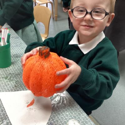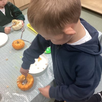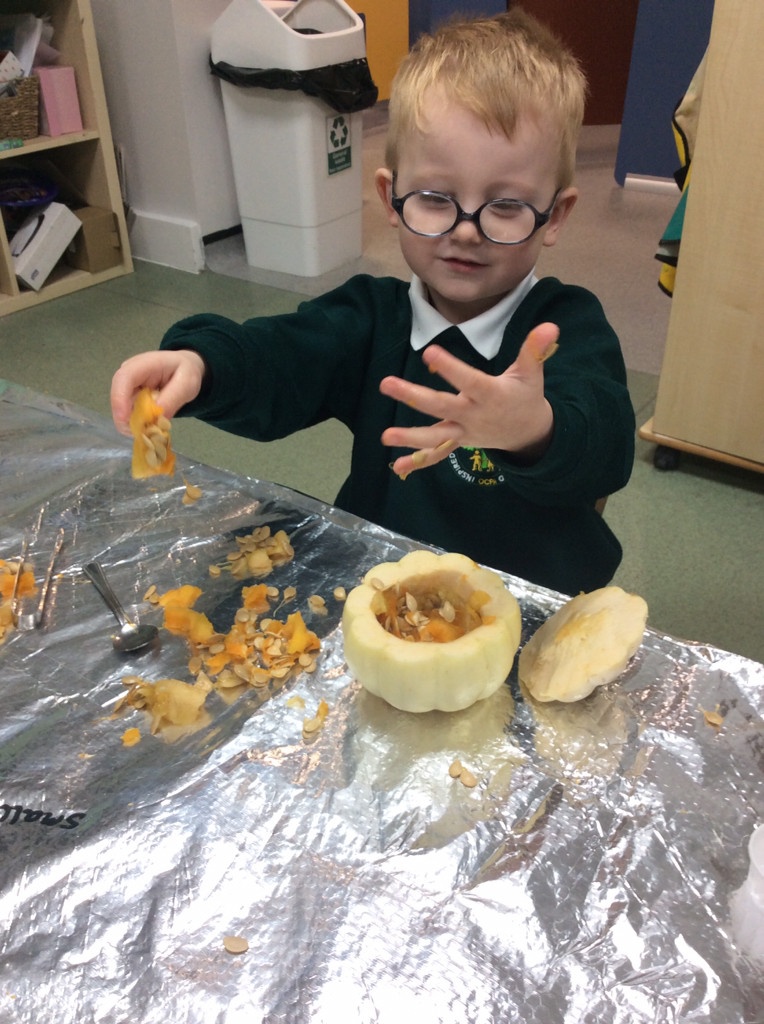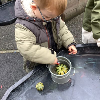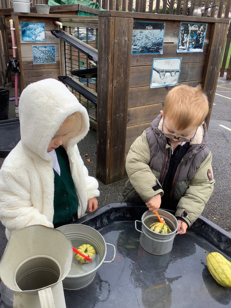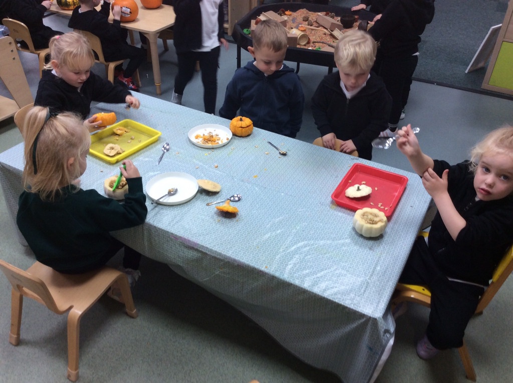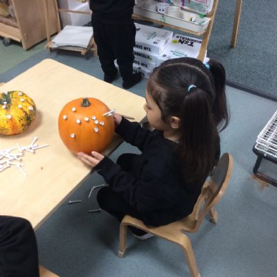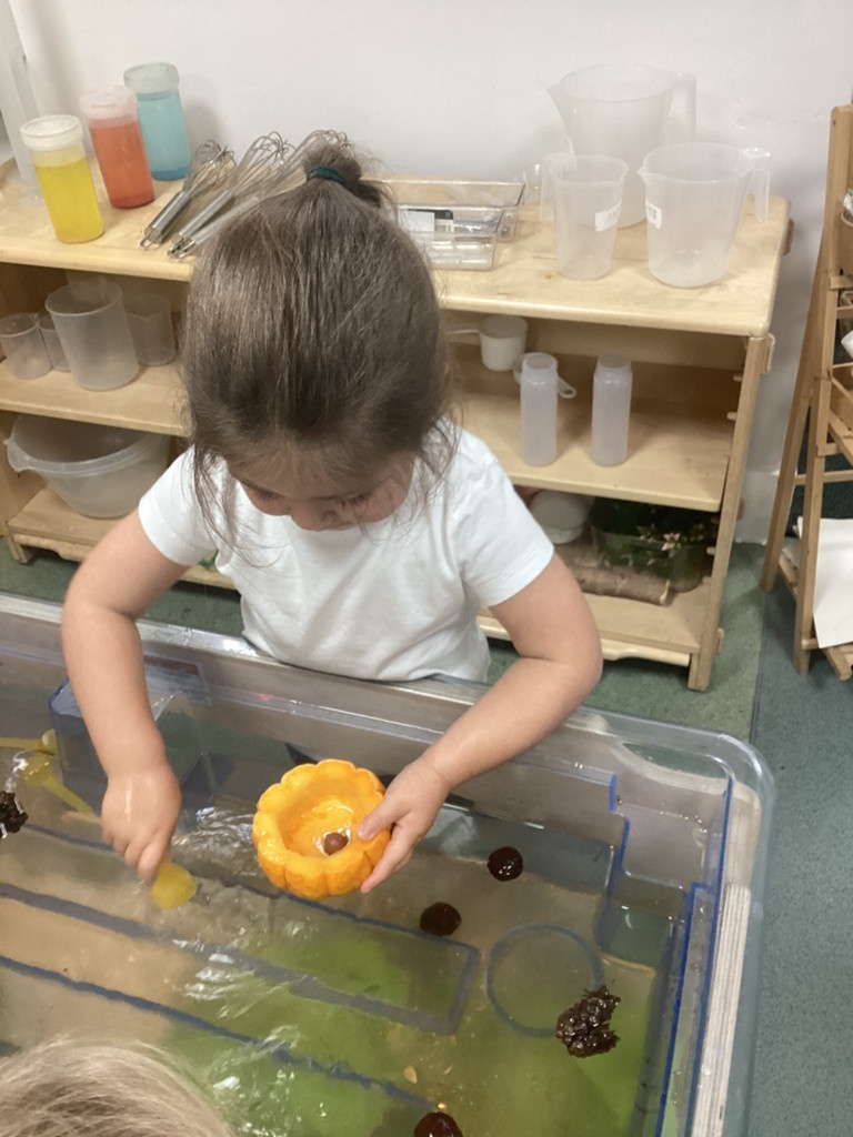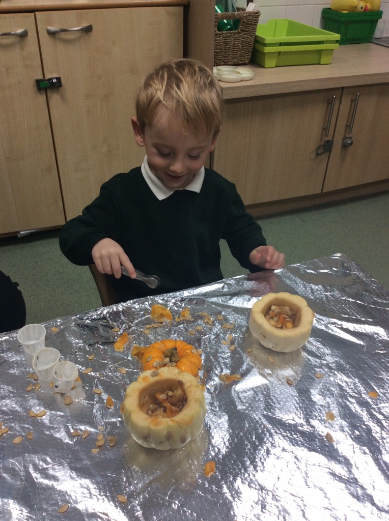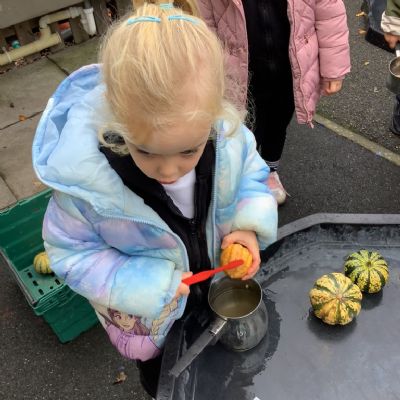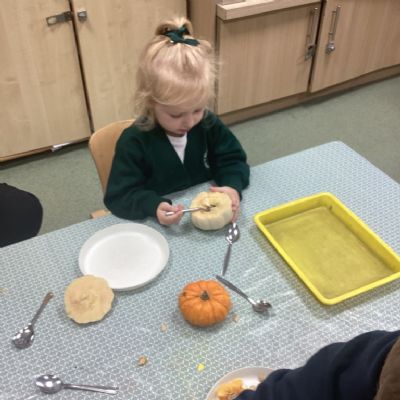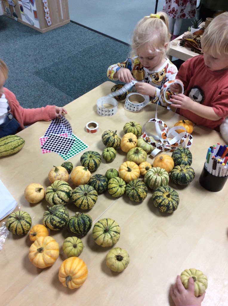 In nursery this week we have been exploring pumpkins! The children have enjoyed feeling the pumpkins, smelling them and helped scoop out the seeds to create boats for the water tray. We have also been practicing our fine motor skills and building up our muscles by hammering tees into the pumpkins, we even added elastic bands to strengthen our fingers.