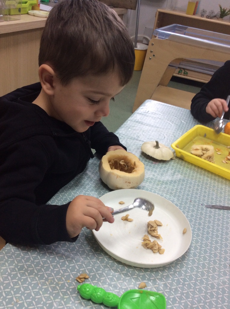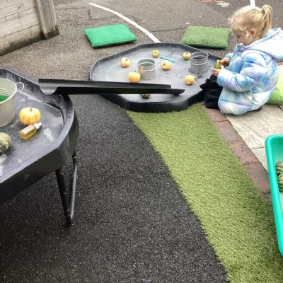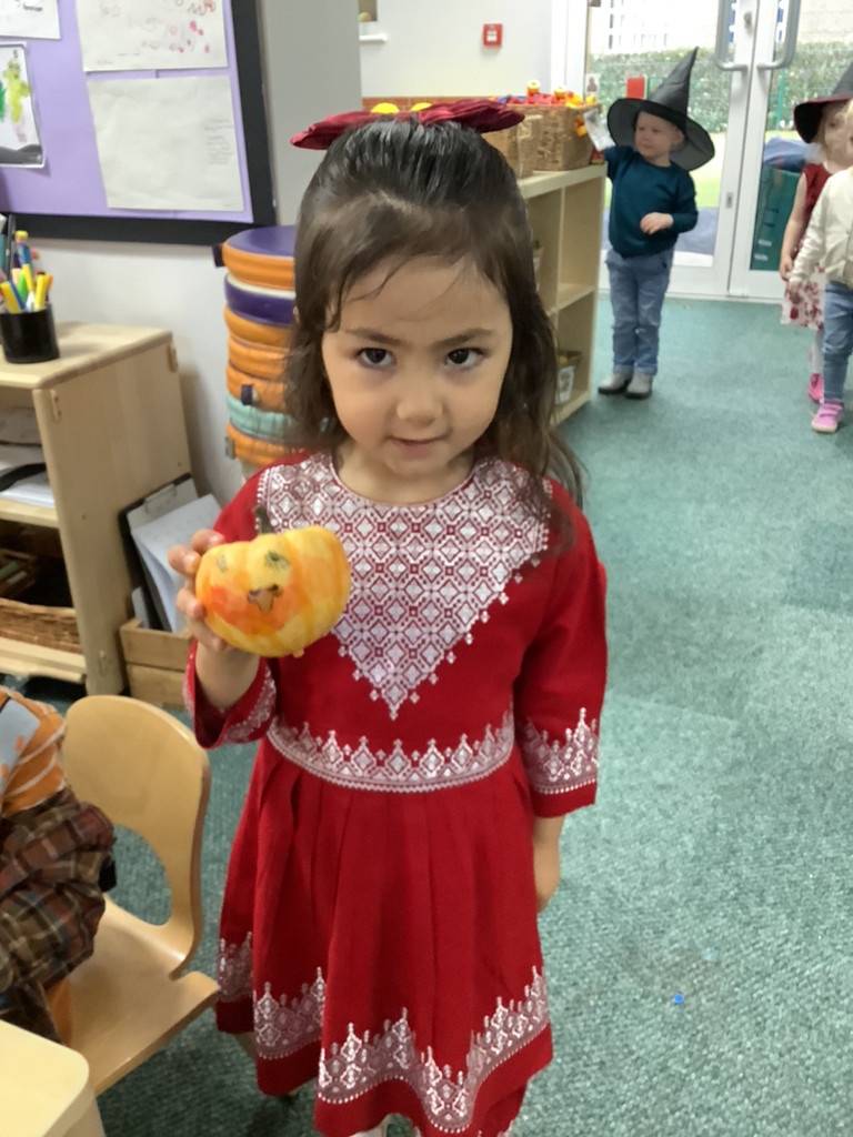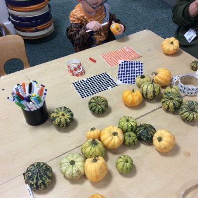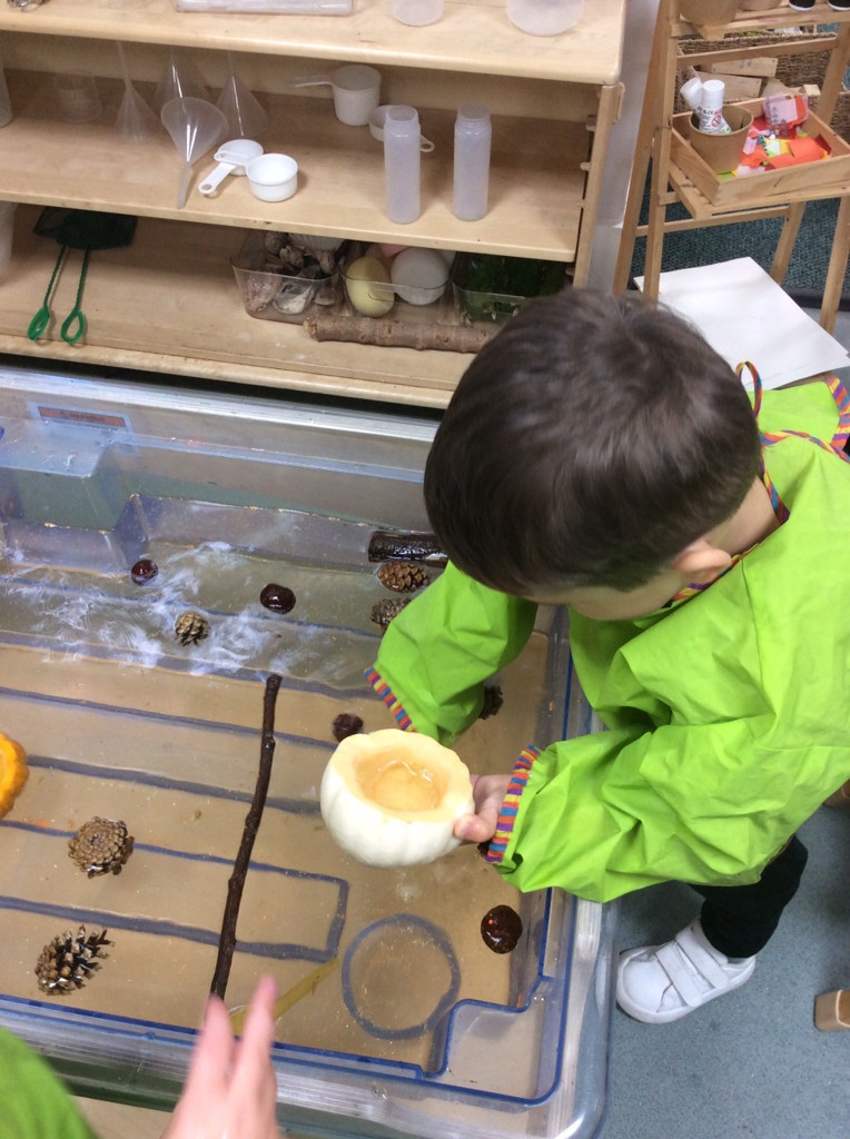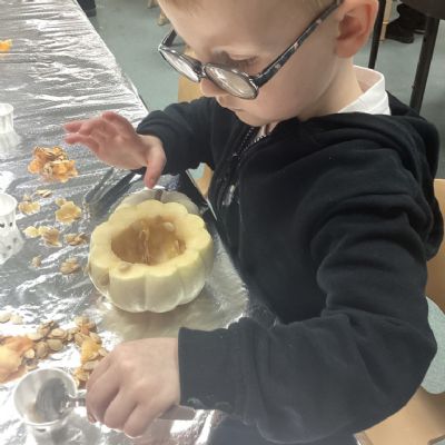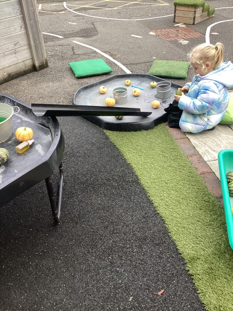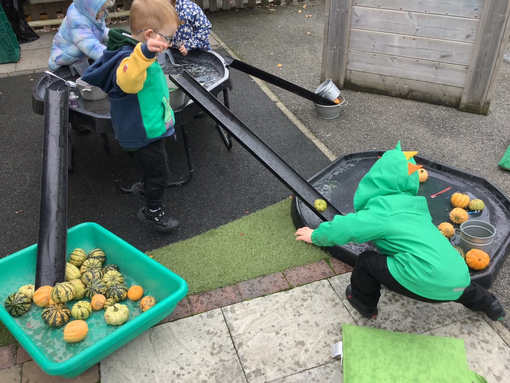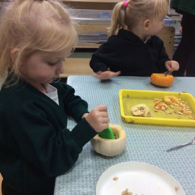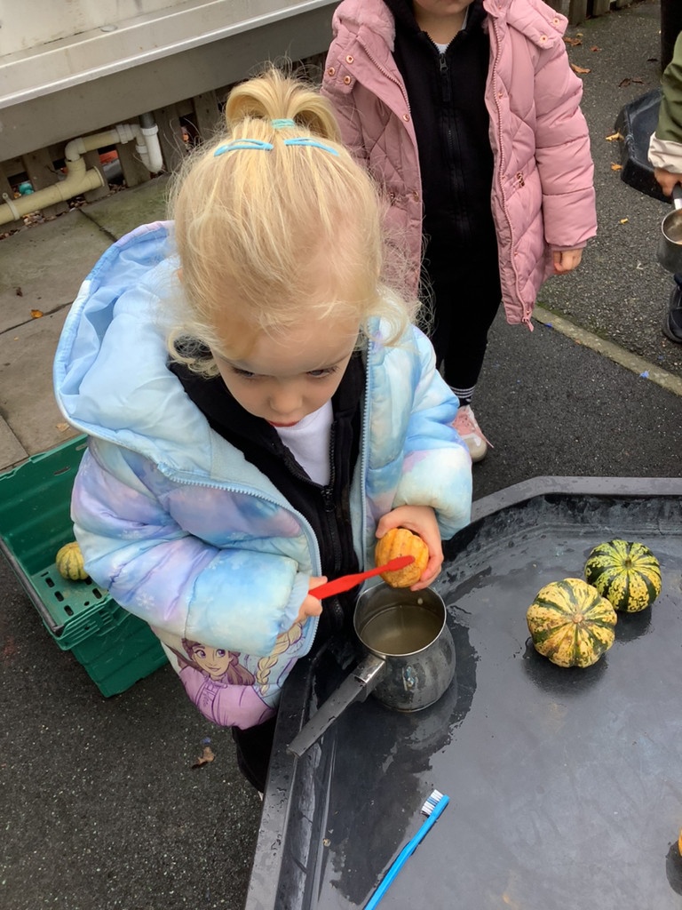 In nursery this week we have been exploring pumpkins! The children have enjoyed feeling the pumpkins, smelling them and helped scoop out the seeds to create boats for the water tray. We have also been practicing our fine motor skills and building up our muscles by hammering tees into the pumpkins, we even added elastic bands to strengthen our fingers.