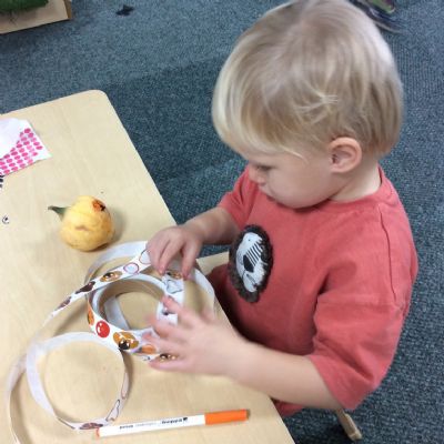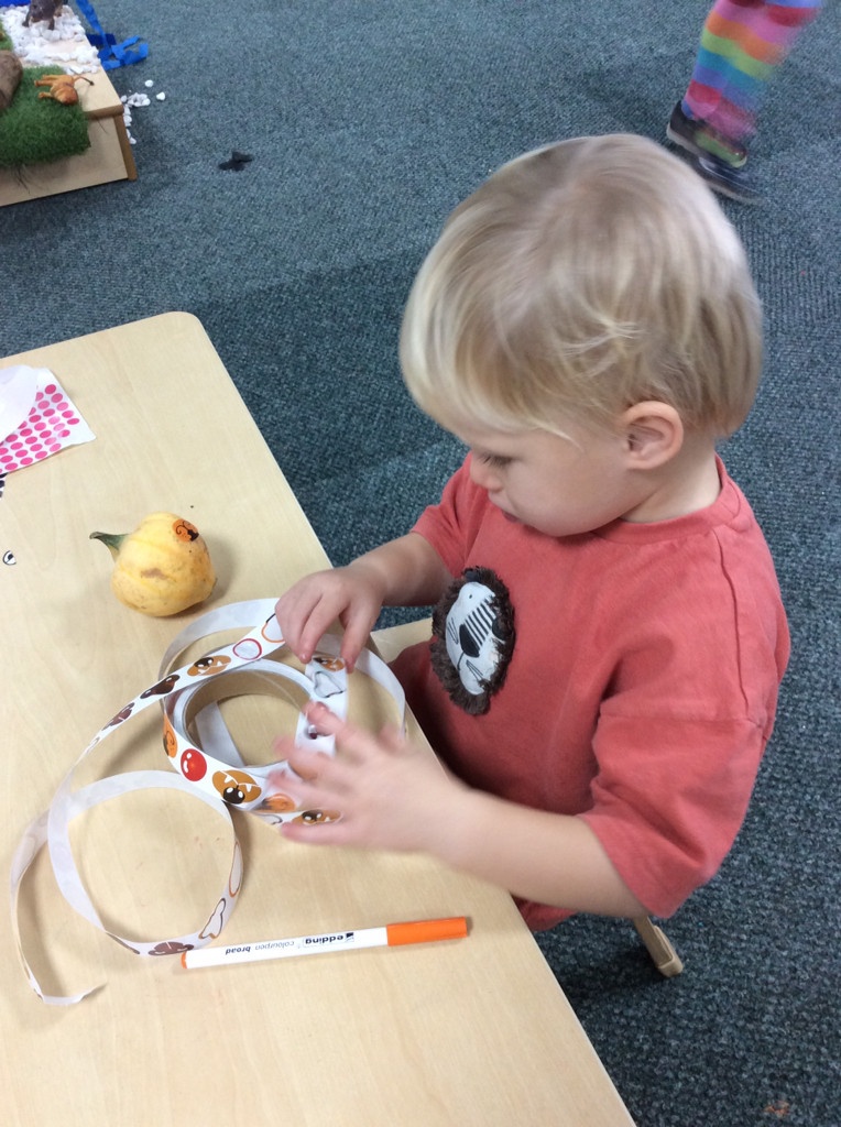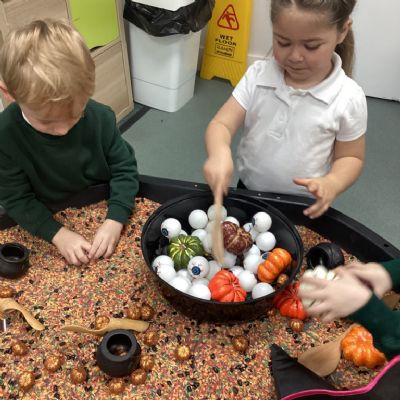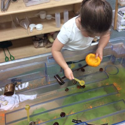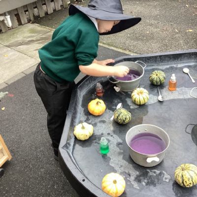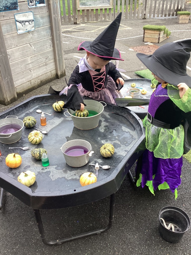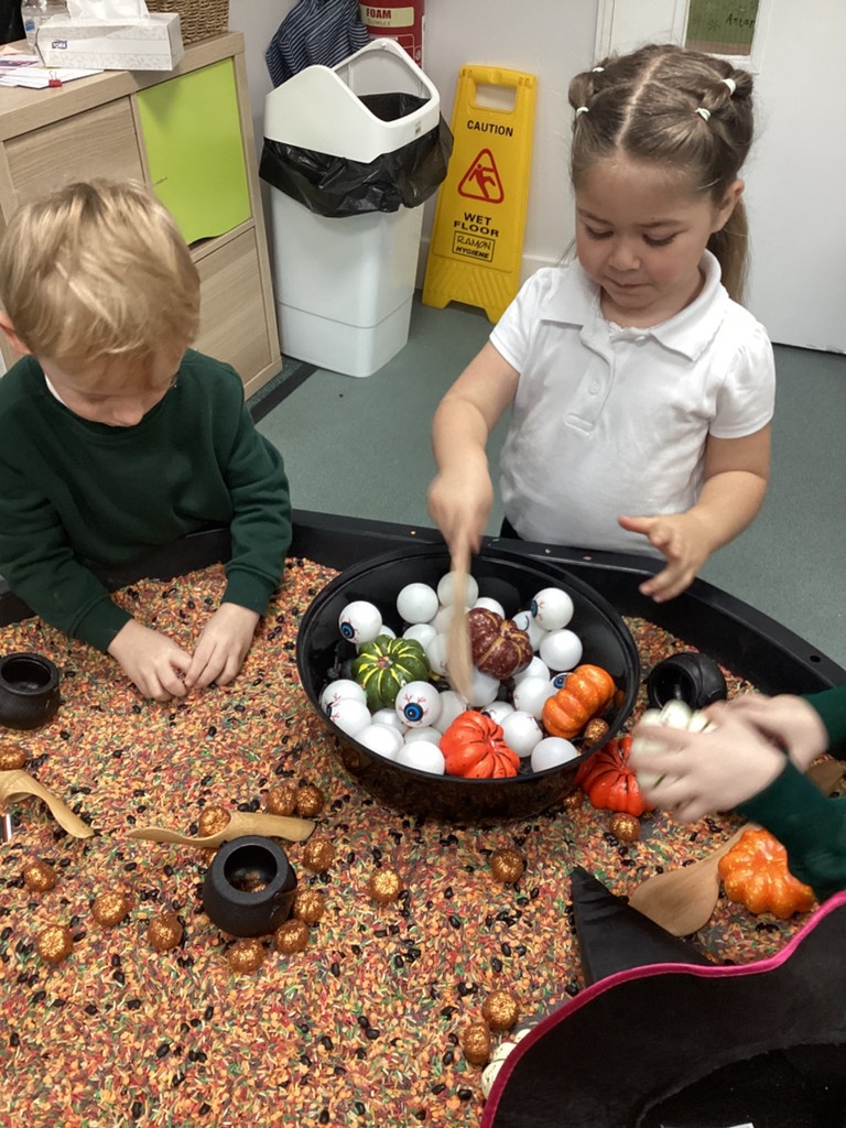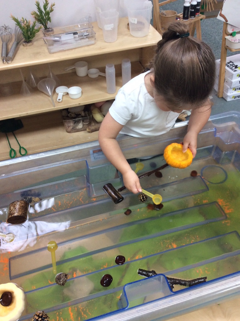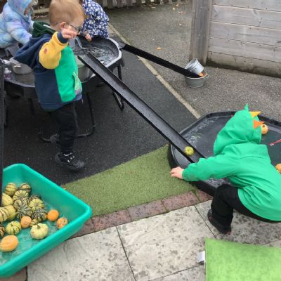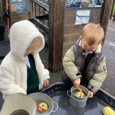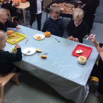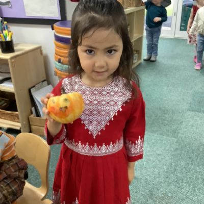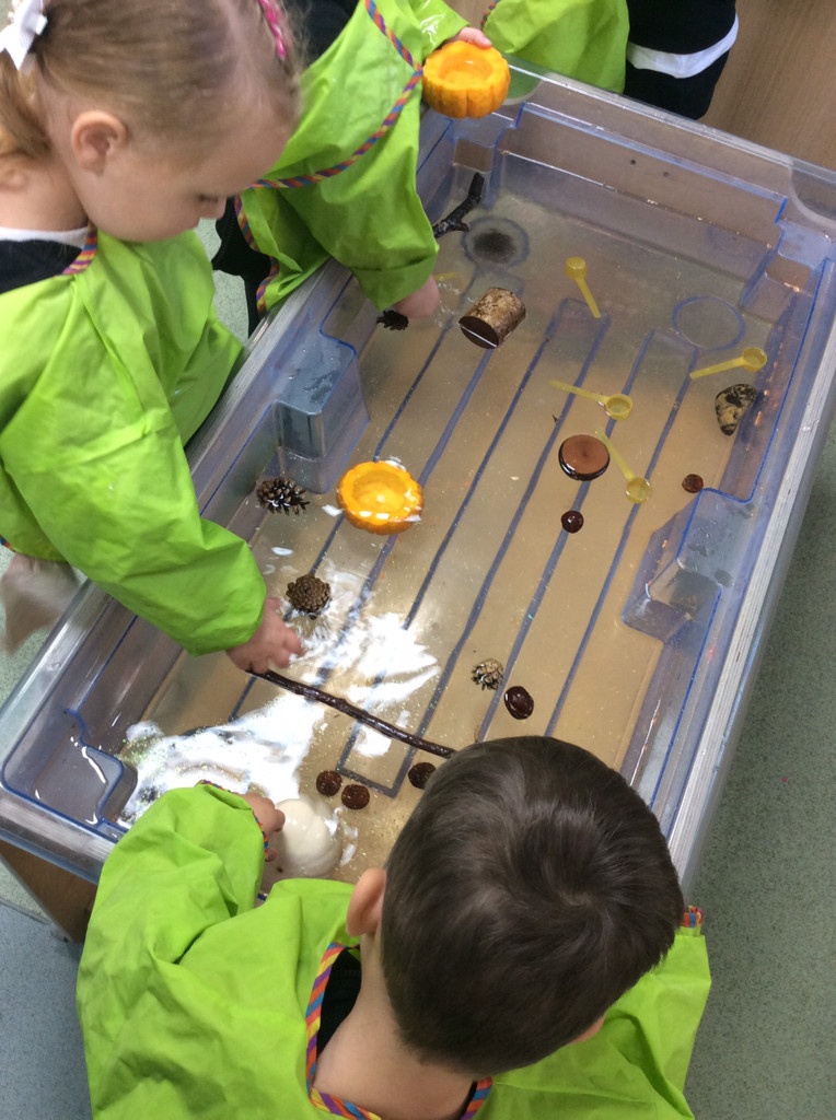 In nursery this week we have been exploring pumpkins! The children have enjoyed feeling the pumpkins, smelling them and helped scoop out the seeds to create boats for the water tray. We have also been practicing our fine motor skills and building up our muscles by hammering tees into the pumpkins, we even added elastic bands to strengthen our fingers.